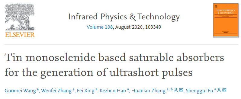 近日,公司激光技术及超快光子学团队在光纤激光器研究方面获得新进展,研究成果以为“Tin monoselenide based saturable absorbers for the generation of ultrashort pulses”为题发表在知名光学类期刊《Infrared Physics and Technology》上,本文王国梅博士为第一作者,通讯作者为张华年副教授、付圣贵教授。