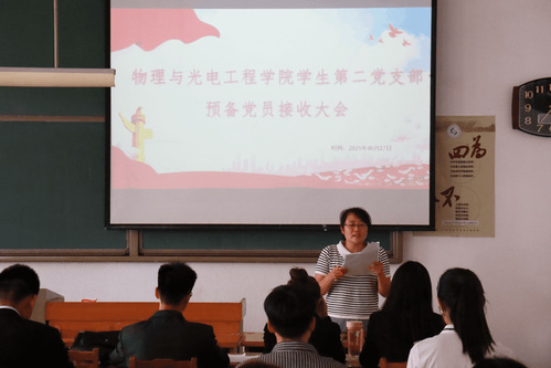 5月27日下午,公司员工第二党支部于15号教学楼338教室举行2021年预备党员接收大会。员工第二党支部书记王芳,支部全体党员以及本次的接收对象参加会议,会议由王芳主持。