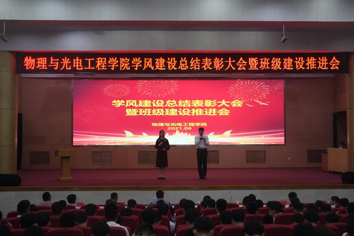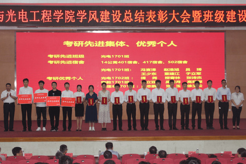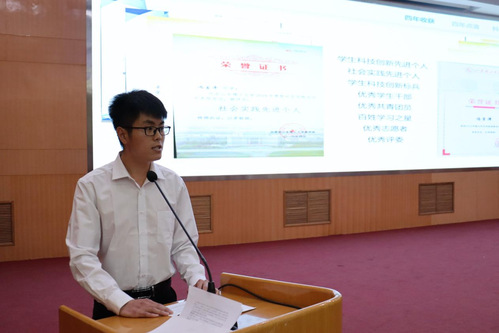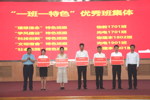 物教1701班吴新月、光电1701班吕琦、物理本1802班王传河、光电1901班陈加刚、物理本1801班惠鸢飞分别代表各自班级进行了汇报,通过精心准备的PPT向大家展现了本班在形成特色班集体过程中的点点滴滴。他们表示班级特色的形成离不开学院的指导和班级同学的共同努力。光电1701班冯言泽做为考研优秀代表发言。把坚持交给自己,把结果交给命运是他的信条。冯言泽表示考研之路,“坚持”二字贯穿始终,也唯有坚持,才能收获成功。最后,他表达了对学校、学院、老师及全体同学的感谢之情。