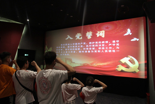 志愿服务结束后,大家进行庄严宣誓。“我志愿加入中国共产党,拥护党的纲领,遵守党的章程……随时准备为党和人民牺牲一切,永不叛党!”铮铮誓言在影厅内回响,表明了支部党员对党的坚定信念和为党的事业奋斗终身的决心。